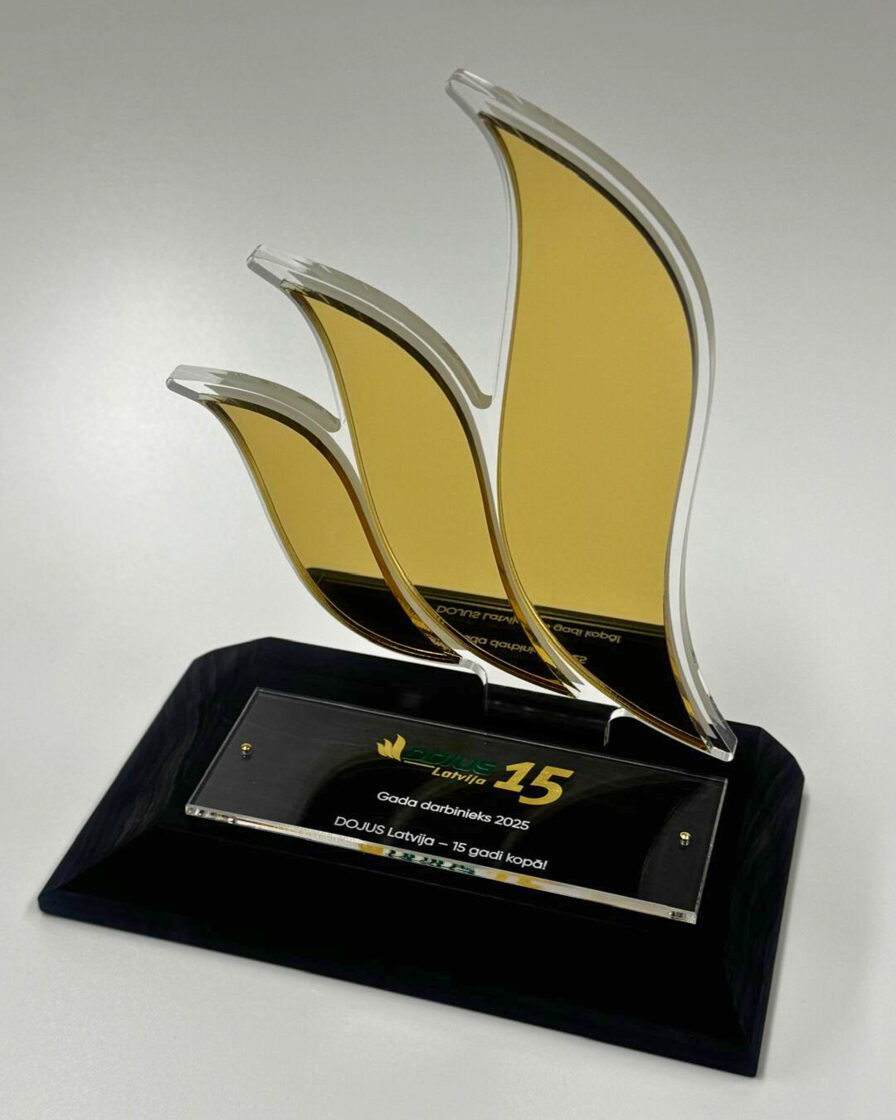 Korporatīvajā vidē apbalvojums ir vairāk nekā tikai priekšmets – tas ir simbols pateicībai, lojalitātei un sasniegumiem. Mūsu jaunākais projekts uzņēmumam "DOJUS Latvija" ir spilgts piemērs tam, kā, apvienojot klasiskus materiālus ar modernām tehnoloģijām, var radīt patiesi ekskluzīvu trofeju 15 gadu jubilejas svinībām.